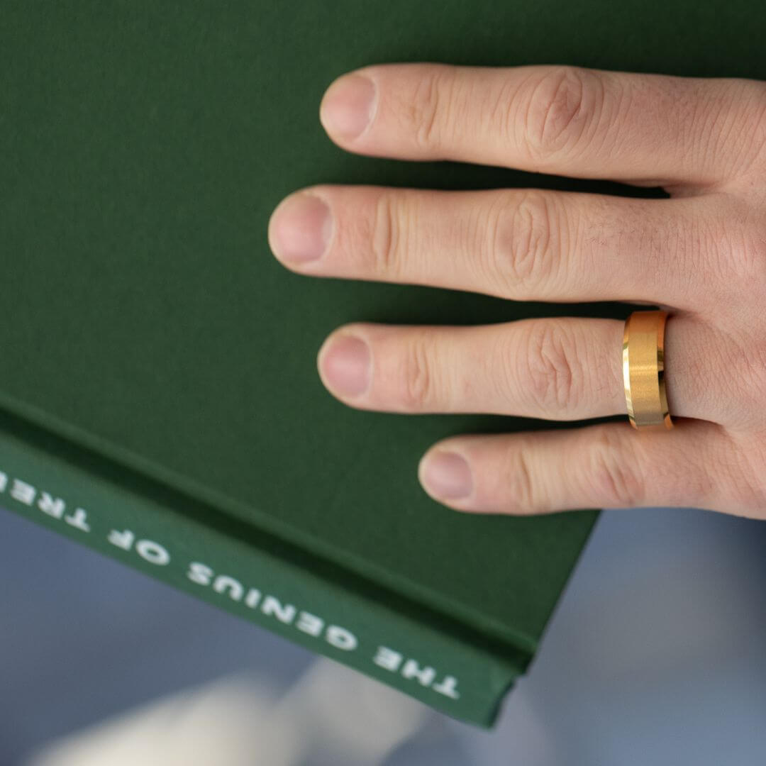 A tungsten ring finished in brushed gold with a bevelled edge. The contrast between its matte exterior and black-plated interior gives it a clean, modern presence.